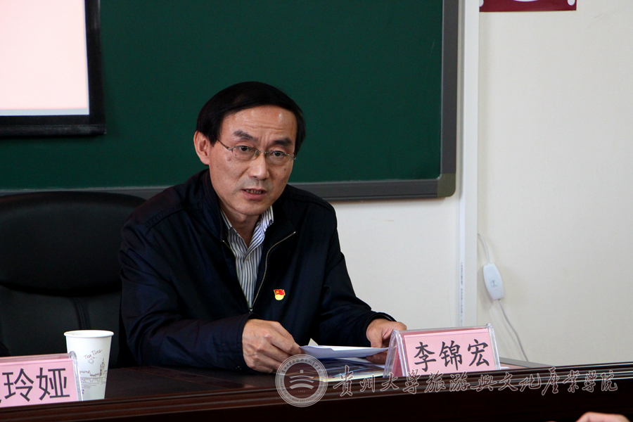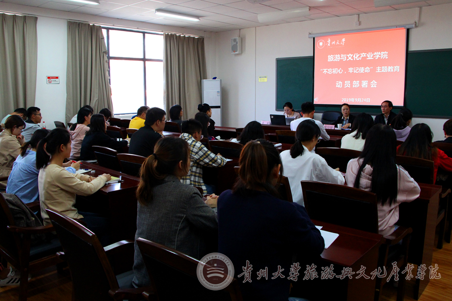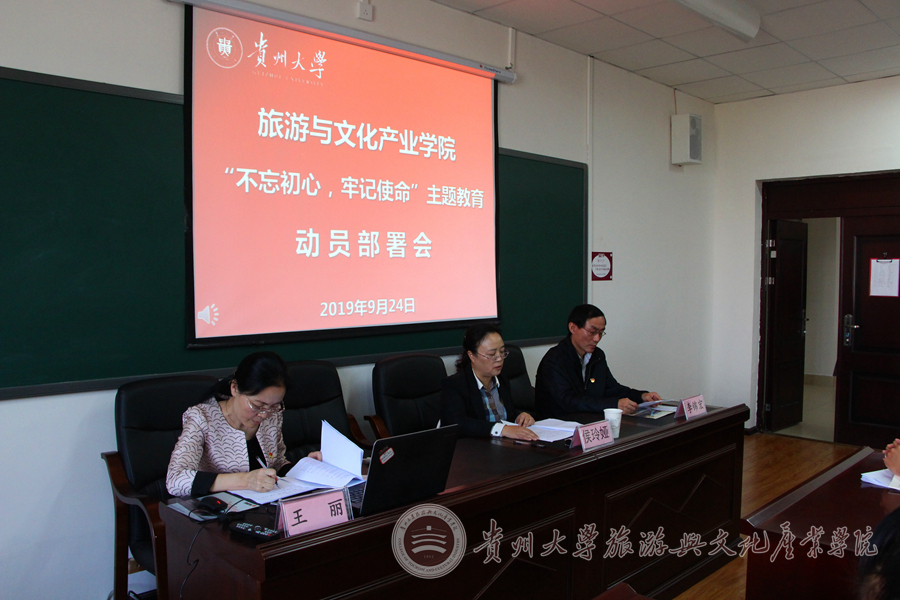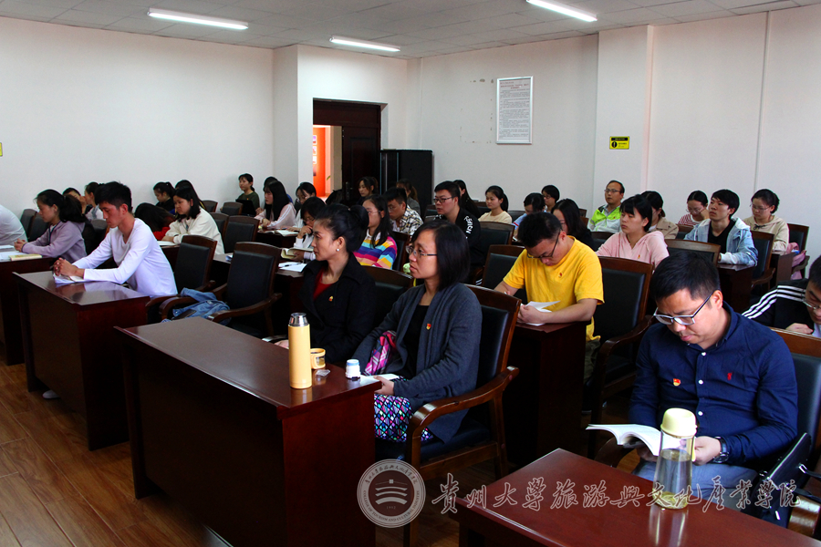 会议第二阶段,王丽同志带领全院师生党员学习《中共贵州大学旅游与文化产业学院委员会“不忘初心、牢记使命”主题教育实施方案》。