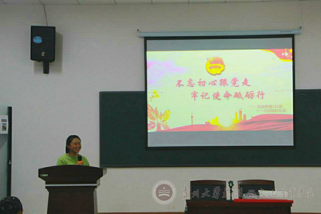 10月31日晚上八点半在雅正楼115报告厅,各组同学代表上台讲述了70年来国家的光阴故事,PPT的播放配合他们精彩的演讲,将同学们对国家变化的感慨表现得淋漓精致。之前的乒乓球比赛过后,各组之间的分数还没有那么明显,而接下来的猜字谜活动为冠军做了铺垫。主持人提出问题后,同学们积极参与答题,为自己团队赢下不少分数。之后,全班同学拉着横幅拍照,并在横幅上签字,纪念这一次活动的完美开展。同学们还观看了“回望共青团峥嵘岁月”的影片,影片结束后,同学们积极写下了观后感,并通过画海报的形式更加形象地表现出来。通过前期充分的准备与后期同学们的积极配合,贵州大学旅游与文化产业学院旅游管理182 班11月团组织生活圆满结束。
