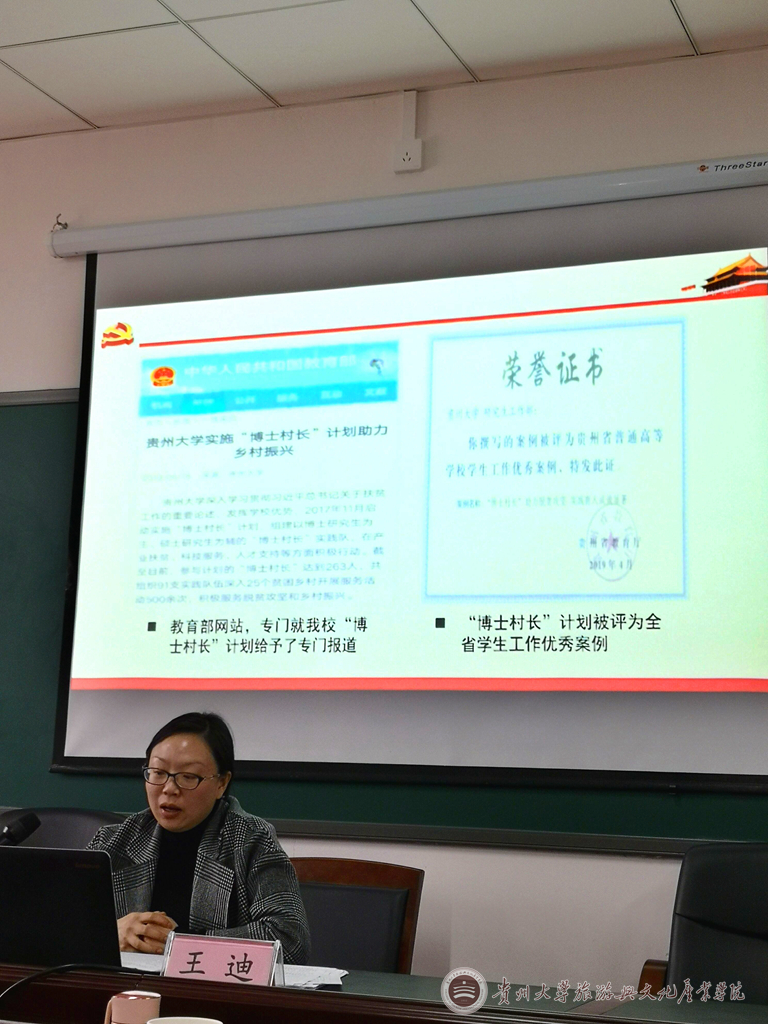 王迪紧紧围绕习近平总书记在2011年5月9日视察贵州大学时重要讲话精神、习近平总书记对贵州工作重要指示精神和关心关爱贵州的故事、贵州脱贫攻坚和贵州大学积极服务脱贫攻坚的具体实效, 以及新时代对教师的要求、教师队伍中的时代楷模和贵州榜样等方面内容,进行了专题讲解,交流了学习体会。