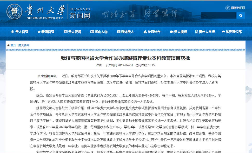 据国际交流与合作处处长洪云介绍,继2002年贵州大学与加拿大魁北克大学项目管理专业硕士教育项目获批,成为贵州省第一个中外合作办学项目后,今年贵州大学与英国林肯大学合作举办旅游管理专业再次获批国家中外合作办学项目,实现了贵州大学合作办学本科项目“零的突破”。该项目拟纳入国家普通高等教育招生计划,学生需参加全国普通高等学校统一入学考试,并符合相关招生录取规定和要求。项目自2019年至2023年每年招收一期,每期招收本科生120人,学制4年。项目采取3+1双学位的合作办学模式,前三年学生在贵州大学进行学习,符合英国林肯大学规定条件者,最后一年前往英国林肯大学进行学习。达到本项目规定的学业标准,经考核合格,获得中国贵州大学颁发的本科毕业证书和学士学位证书以及英国林肯大学颁发的学士学位证书。若学生最后一年不能前往英国林肯大学学习则继续在中国贵州大学完成最后一年学业,达到毕业要求者获得贵州大学颁发的本科毕业证书及学士学位证书。