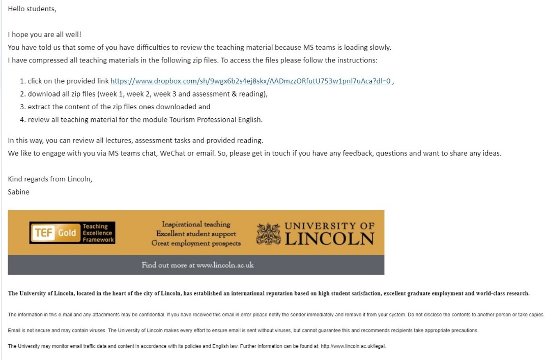 为了顺利开展在线教学,切实保证教学质量,学院领导班子,国际旅游教研室和英国林肯大学国际处(International Office)和国际商学院(International Business School)第一时间成立线上教育工作小组,部署线上教学工作,全方位推进在线教学的顺利开展。
