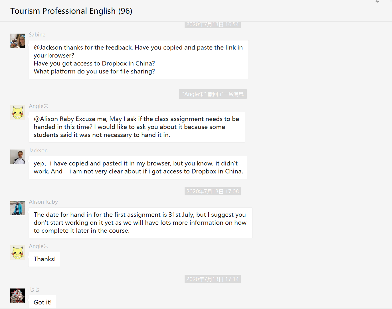 英语课程《Tourism Professional English》使用国际通行的Zoom, Microsoft Teams和Quizlet平台,采用“直播+录播+课件发布+在线答疑+作业检查”等形式进行授课,并创建了课程微信群作为师生沟通答疑的方式,最大程度保证学生线上学习的顺利进行。