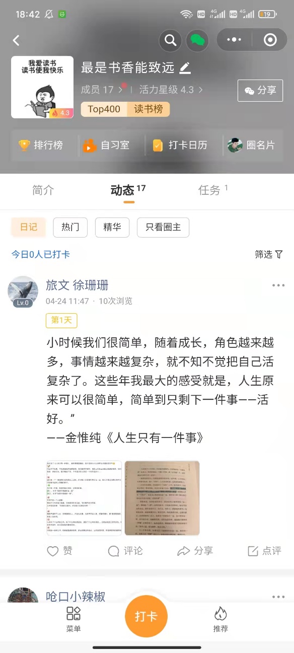 四月伴随着和煦的春风,第27个世界读书日悄然而至。丰富多彩的阅读活动吸引同学们踊跃参与,氤氲书香助力营造全民阅读的浓厚氛围。作为建设学习型社会的青春力量,当代大学生的阅读水平事关祖国的未来,事关民族的兴衰。为此,贵州大学旅游与文化产业学院研究生以“青春与阅读齐飞,成长携书籍同行”为题,开展“最是书香能致远”微信小打卡活动。打开一本书静心阅读,加入读书小组,全体研究生同学积极参与读书打卡活动,分享一本书,讲述自己读书时的所想所感。