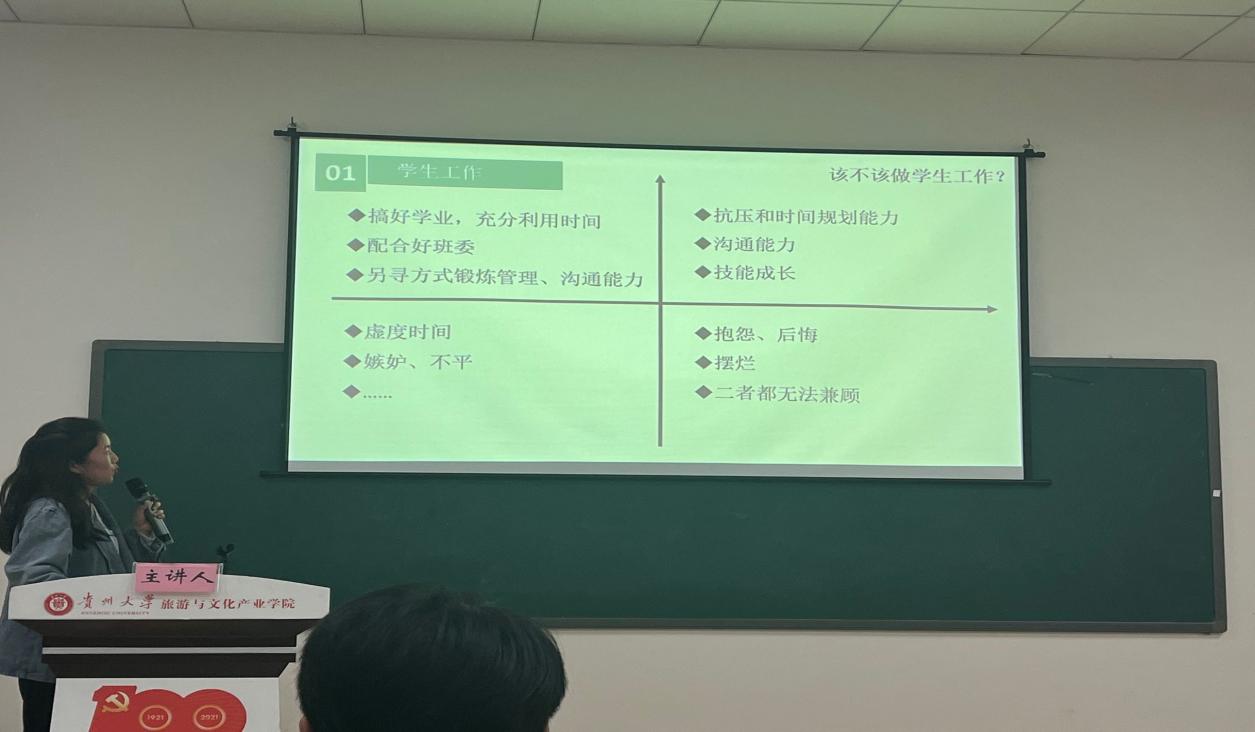 日前,我院于雅正楼115成功举办对话国奖励志成长主题活动。国奖获得者2018级蒋诗倩同学担任此次的活动主讲人,从平衡生活与学习、平衡科研与学生工作两方面出发,与同学们交流学习经验、分享成长感受。