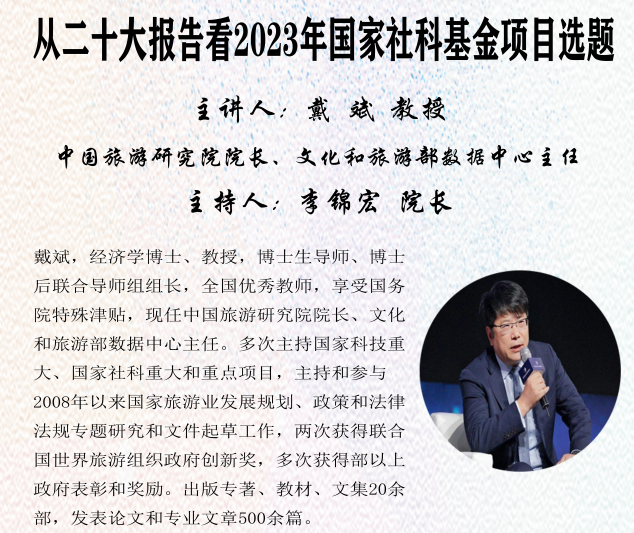 本次研讨会紧密围绕“2023年旅游与文化产业学科热点与国家基金项目申报辅导暨选题研讨”共分为“为旅游赋能思想,给文化市场力量”、“当前乡村旅游发展新热点与理论研究新需求”、“四个面向与国家基金申报的应变思路”、“旅游人类学视野下国家社科与自科基金的跨学科选题”、“人类学的旅游研究”五个专题。