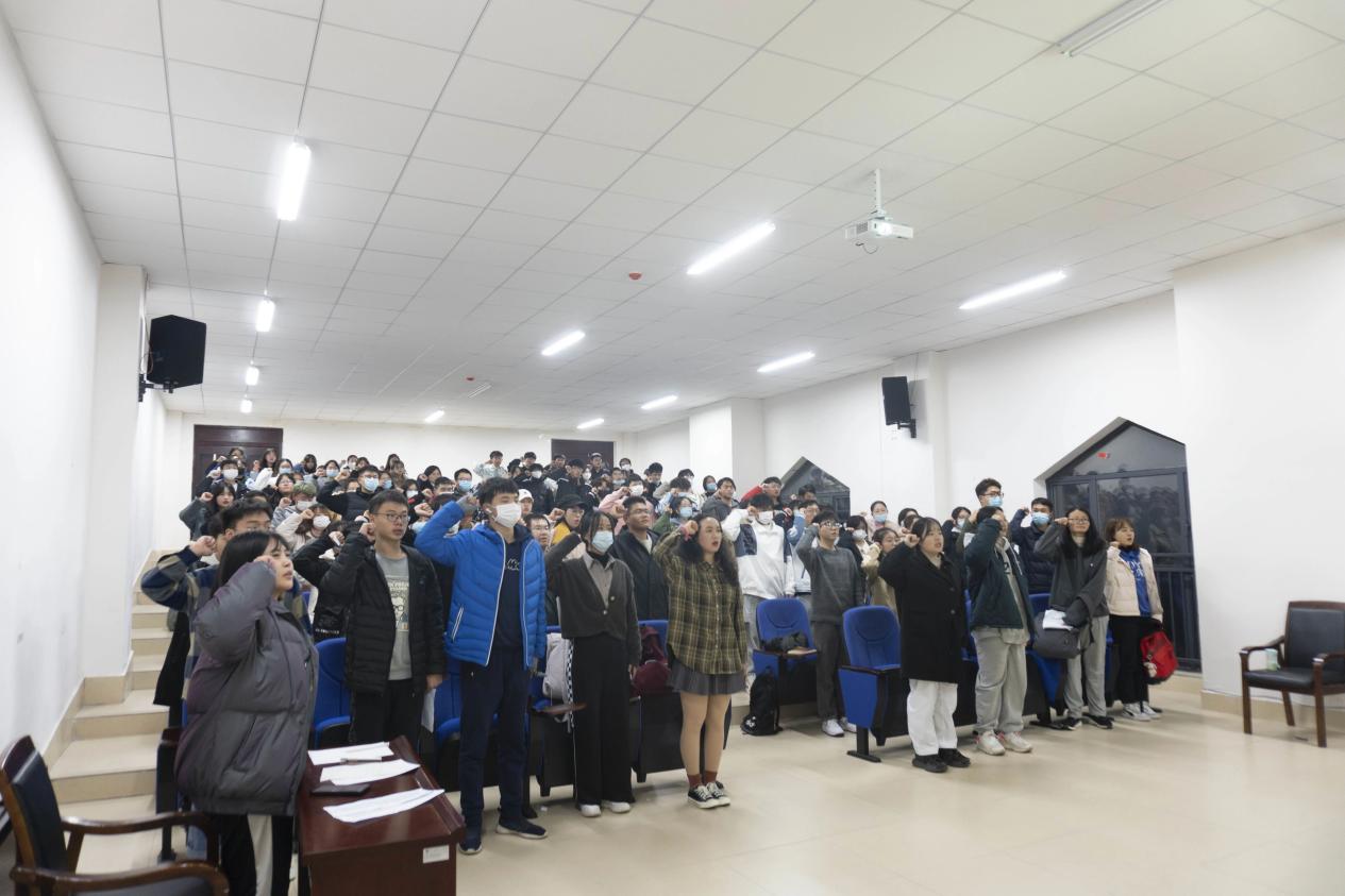 由主持人带领全体团员宣誓,庄重的誓言让同学们更加明晰自己作为新时代青年学子应当担当的使命与责任,一句句嘹亮的宣誓词更是同学们对党和团的庄重承诺。