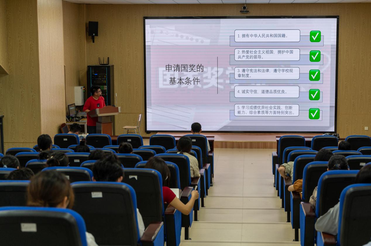 耿宗民同学曾获得国家励志奖学金、青少年模拟政协提案贵州省二等奖、校二等奖学金、校三好学生等奖项。耿宗民同学对大学生相关资助政策进行宣讲,并分享了自己的求学历程,他鼓励同学们在求学路上要自强自立、永不言弃。