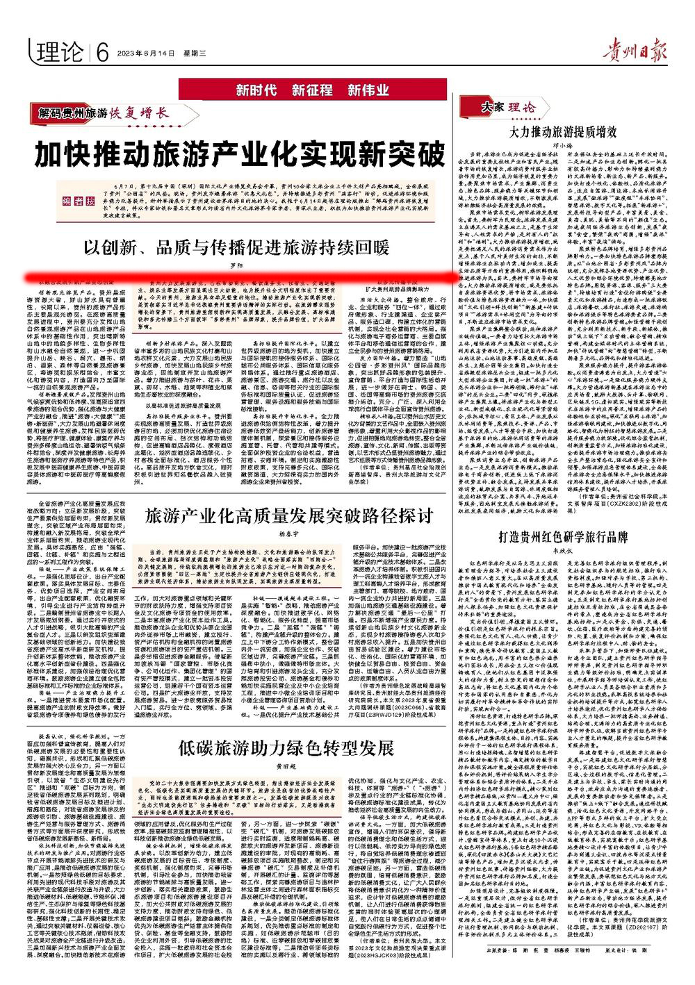 贵州大力发展旅游业,已在带动商业、餐饮服务业、住宿业、交通运输业、娱乐业等发展方面显现出巨大动能,也为提升社会文明程度作出了重要贡献。今天的贵州,旅游业具有举足轻重的地位。推动旅游产业化实现新突破,是贯彻落实习近平总书记视察贵州重要讲话精神的实际行动。在旅游需求强势增长的背景下,贵州旅游亟须创新和实现高质量发展,从融合发展、高标准建设和多元传播三个方面筑牢“多彩贵州”品牌形象,提升品牌价值,扩大品牌影响。