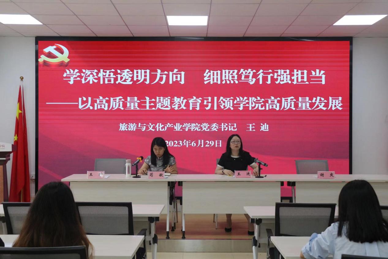 王迪强调,党的十八大以来,习近平总书记围绕“政绩为谁而树、树什么样的政绩、靠什么树政绩”等问题,发表一系列重要论述,为广大党员干部干事创业提供了根本遵循。在工作实践中,我们要深刻学习领会习近平总书记关于树立和践行正确政绩观的重要论述,学习践行“千万工程”“浦江经验”,既带着问题去调研,又通过调研发现问题,主动入位、躬身入局,聚焦围绕“四新”主攻“四化”主战略、实现“四区一高地”主定位,找准旅文学院定位和坐标,以时时放心不下的责任感、积极担当作为的精气神履好职、尽好责,广泛汇聚改革创新的强大合力,共同奋力谱写贵大旅文高质量发展新篇章。