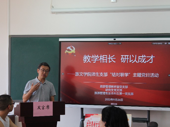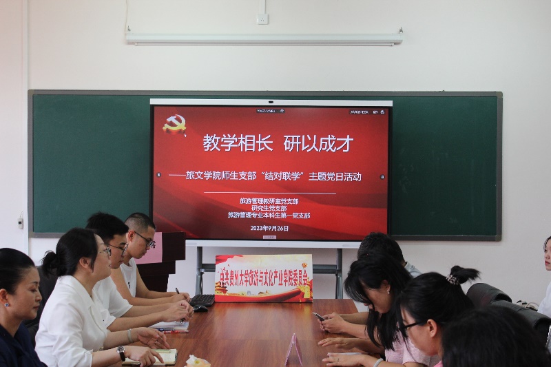 2023年9月26日中午,贵州大学旅游与文化产业学院“教学相长研以成学”师生支部“结对联学”主题党日活动在雅正楼309教室开展,旅游管理教研室党支部、研究生党支部、旅游管理本科生第一党支部全体党员参加,二级教授、旅游管理教指委委员金颖若老师、贵州省A级景区及旅游度假区评定专家胡书玲老师、浙江大学博士向富华老师作主题交流发言,学院党委书记王迪、党委副书记晏超以普通党员身份参加此次主题党日活动。