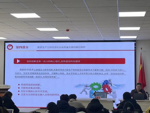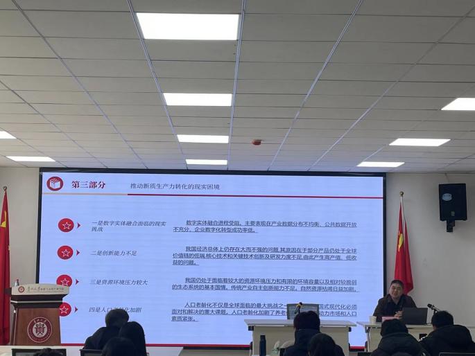 接着,文丰安教授在讲座的第三部分强调了新质生产力对我国经济社会发展的重要作用,指出当前我国推动新质生产力转化仍面临四个现实困境:一是数字实体融合面临的现实调整;二是创新能力不足;三是资源环境压力比较大;四是人口老龄化加剧。对此文丰安教授展开了具体的阐述,对未来新质生产力的转化寄予厚望。最后,文丰安教授讲解了新质生产力对经济社会高质量发展的可能路径,包括坚持完善科技创新体系,加快实现高水平科技自立自强、坚持以战略性新兴产业以及未来产业为主要阵地。