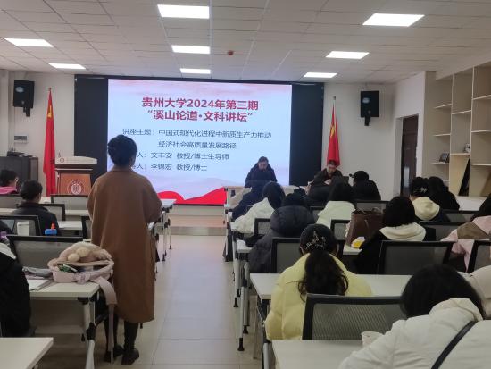 为高质量推进我院旅游管理、文化产业管理学科建设,营造浓厚的学术氛围,提升教师的教学与科研能力,提高研究生、本科生的学术思维和素养,我院于3月8日邀请文丰安 教授/博士生导师为全体师生开设线下专题学术讲座,讲座主题为:“中国式现代化进程中新质生产力推动经济社会高质量发展路径”,部分师生代表于雅正楼316会议室参会。本次会议由学院院长李锦宏教授/博士主持。