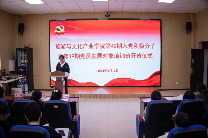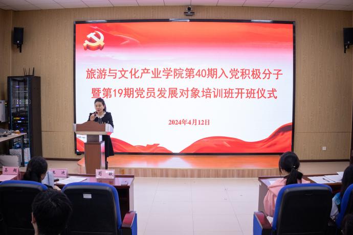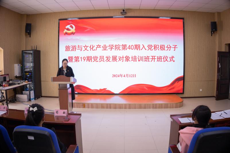 2024年4月12日中午,旅游与文化产业学院第四十期入党积极分子暨第十九期党员发展对象培训班开班仪式在雅正楼115顺利召开。学院党委书记王迪、党委副书记晏超、副处级组织员苟敏及全体学员参会,仪式由苟敏老师主持。