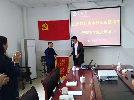 最后,张国芳一行对茶院表达感谢,感谢学院于9月为长田镇举办的为期3天的2018脱贫攻坚“夏秋攻势”茶叶管护与制作专题培训会及实地技术指导。此行,镇政府专门为学院送了一面锦旗,内容为:脱贫攻坚 ,产业扶贫,茶技培训,小康征程,无私奉献,百姓感恩。