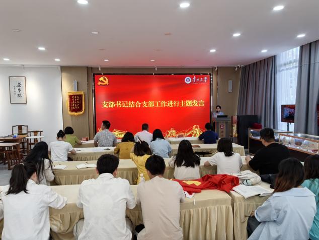 教工支部书记黄小贞、研究生支部书记邓燕莉、本科生支部书记王振分别结合支部工作和岗位工作做了主题发言。三位支部书记讲到要按照“三茶统筹”要求,老师和同学们做好茶文章,在质量提升上做好文章,把贵州品牌打得更响,附加值更加提升,农民有更多收入,就是要往深里做,高端走一步。党员同志们要做好带头作用,积极参加创新创业工作,做好产业服务工作,为茶学院、贵州大学和贵州省茶产业的高质量发展做出党员应有的贡献。