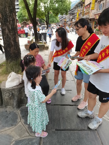 此外,在7月20日下午,实践队及县禁毒办也走进了黔东南州肇兴侗寨开展禁毒宣传“进村寨”活动。实践队队员准备了礼品,以寓教于乐的方式,让一些当地的居民和游客主动参与禁毒活动,并学习禁毒知识。居民和游客也在此次活动受益匪浅。有位老奶奶道:“我是一辈子不会碰这些东西的,我不想让自己家破人亡。”此外,黎平县公安局缉毒大队的警察和实践队队员通过悬挂禁毒宣传横幅、发放禁毒宣传手册的方式,与来往的群众进行互动和面对面答疑解惑,告知群众在生活中要主动学习有关毒品知识,了解毒品的危害和成瘾性,坚决抵制毒品诱惑。为了让大家更加清楚明白毒品带来的危害性,实践队的队员也向当地的群众进行宣讲普及,让他们认识冰毒、摇头丸、迷惑蘑菇等新型毒品及它们的危害性,使“识毒、防毒、拒毒”的观念更加深入人心。
