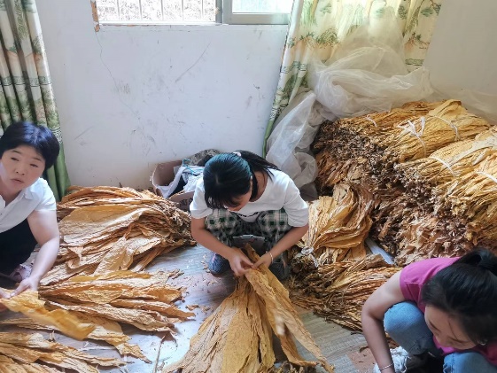 2022年8月19日下午,贵州省贵阳市开阳县楠木渡镇宅吉烟草站职工到农户家指导烟农朋友进行初烤烟叶的初分预检工作。