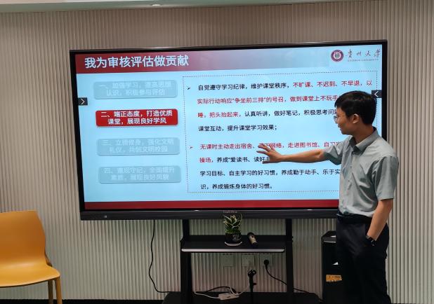 2024年5月24日上午,阳明学院院长段忠贤在南校区溪山书房对46名学生代表开展了本科教育教学审核评估宣讲。段忠贤院长向学生代表们介绍了审核评估的背景和目标,强调了学生在审核评估中的主体地位,以及对学校发展的重要作用。宣讲中强调了“九要九不要”的行为准则,引导学生在评估期间展现出良好的学习风貌和文明礼仪,共同营造积极向上的校园文化氛围。他呼吁学生们要以主人翁的姿态参与到审核评估中来,用实际行动为学校的高质量发展贡献智慧和力量,共同迎接评估,展现贵大学子的风采。