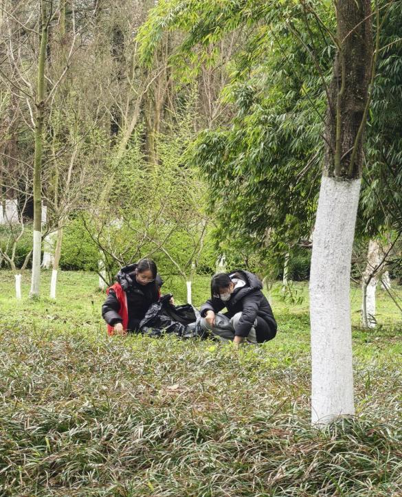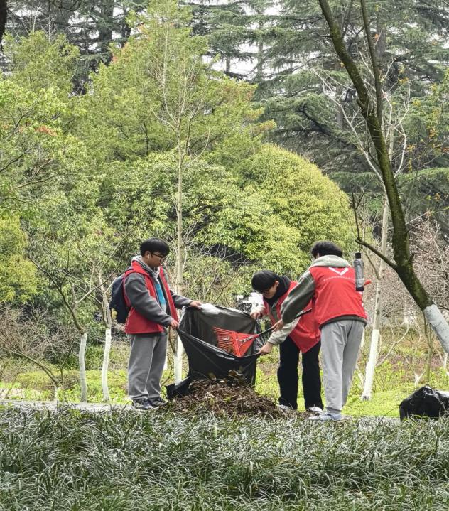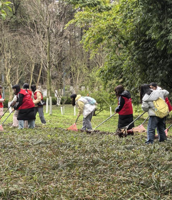 同学们各司其职,分成了几个小组。有的负责清除草丛中的落叶和杂草,他们细心地分辨着脚下的植物,确保只清除杂草而不伤害到初生的春芽;有的则负责清扫人行道垃圾,在保证路面整洁的同时,也在一定程度上提升了通行能力。