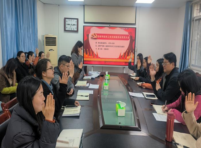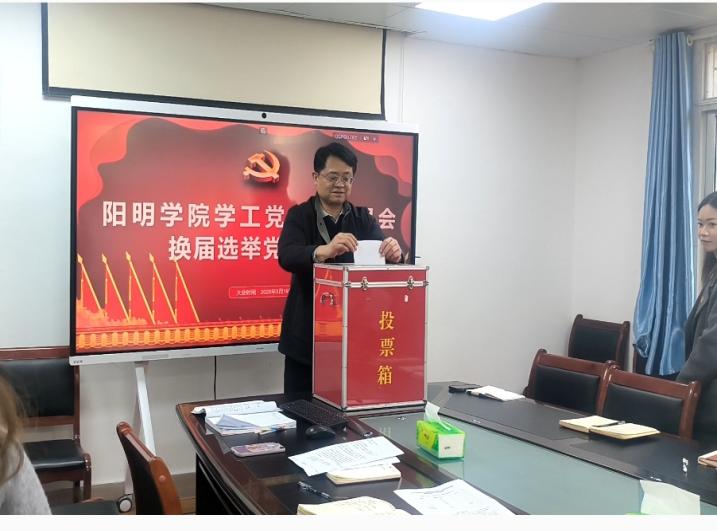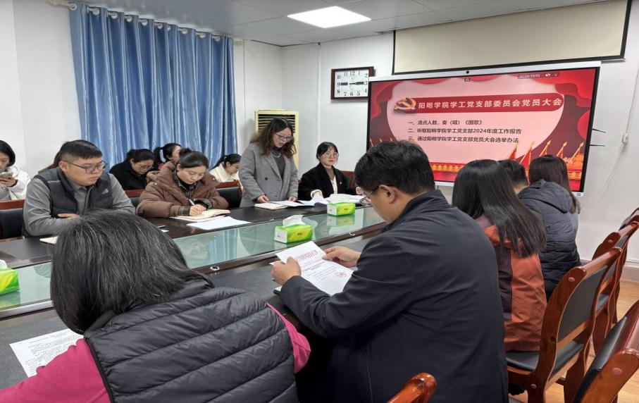 2025年3月19日下午,阳明学院学工党支部在南校区行政楼201会议室召开党员大会,严格按照组织程序完成支部委员会换届选举工作。会议由支部副书记王爽同志主持,院党委副书记谢佳同志代表学院党委出席会议。