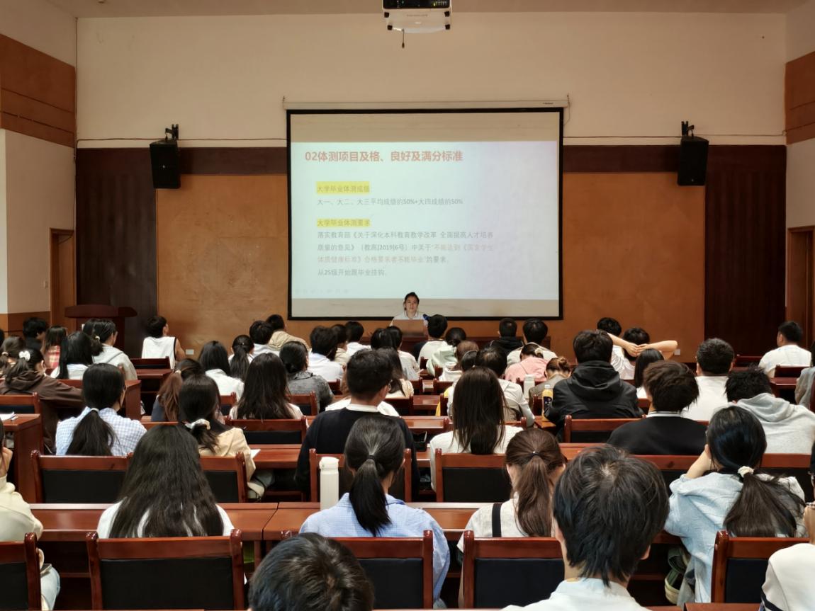 为积极响应党的二十大关于“推进健康中国建设”的战略号召,切实提升学生体质健康水平,5月29日中午,阳明学院在南校区同辉楼609报告厅成功举办了以“体医融合”为主题的学生体质提升专题指导培训。此次培训特别邀请了贵州大学校医院党支部书记、院长雷蕾,以及贵州大学学生体质测试中心(贵州省学生体质健康监测中心)负责人王文菊作为主讲嘉宾,吸引了150名体测成绩未达标及渴望冲刺更高分数的学生踊跃参与。