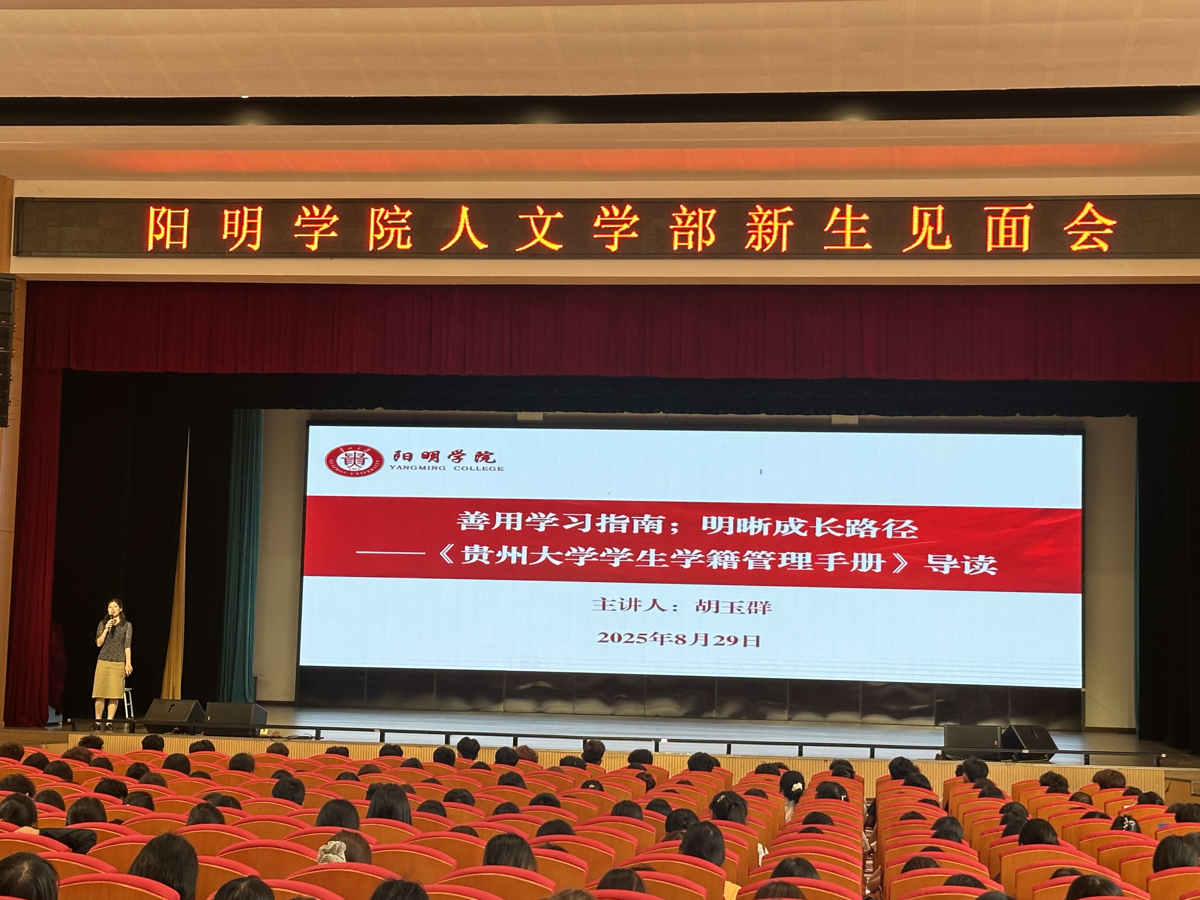 8月29日下午,阳明学院人文学部2025级新生见面会在南校区大礼堂召开。贺越老师甫一出场,便让新生同学们热烈鼓掌,贺老师说道:“刚刚的掌声,是对过去那段拼搏岁月最棒的告别礼,从今天开始,昨日的荣耀与失意皆已翻篇,现在同学们站在了同一条全新的起跑线上,一段名为‘大学’的精彩旅程正式开始了。未来的四年,是一本等待书写的书,笔就握在你们手中,请勇敢而坚定地,写好属于你的第一笔!”