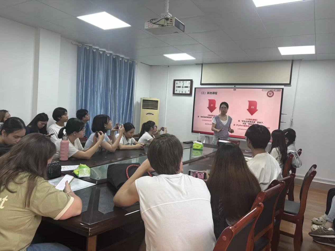 教务办教学秘书刘奕婷则围绕教务系统使用展开详细讲解,内容涵盖登录准备、账号密码修改、选课流程、通识课程及六大模块说明、教务信息查询等,还同步介绍了网络课程的学习方法,为留学生熟悉教务流程提供清晰指引。