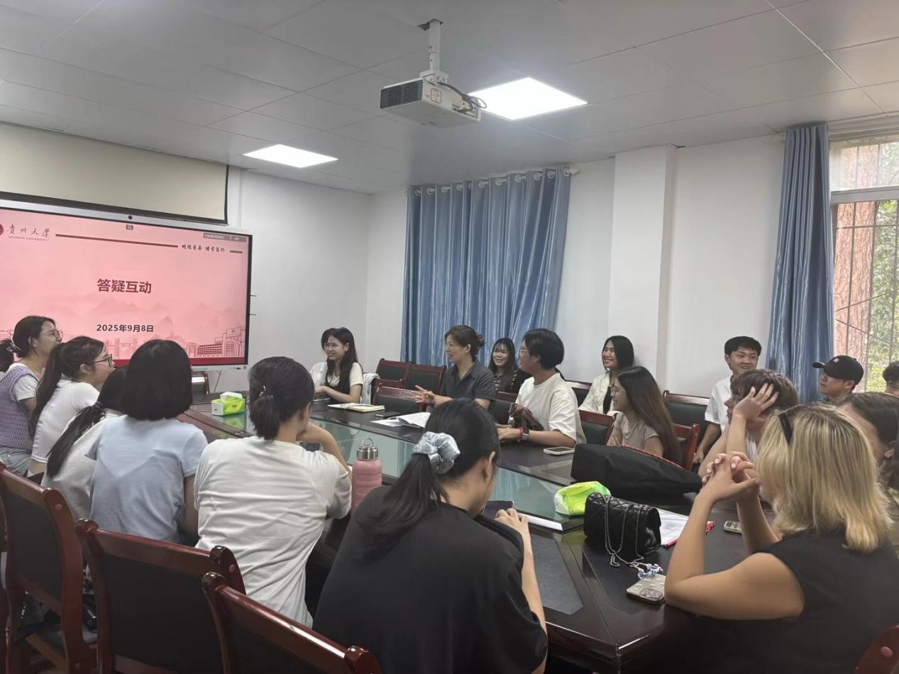 会议尾声,胡玉群副院长就文化交流与校园生活适应给出建议。她表示,大学不仅是获取学位的平台,更是文化互鉴、建立跨国友谊的桥梁,鼓励留学生主动与国内学生交流、积极参与课堂分享和小组讨论,多参加学校及学院组织的读书会、研学等活动,希望大家在贵州大学收获知识与友谊,留下难忘的中国记忆。