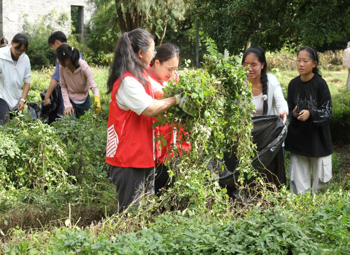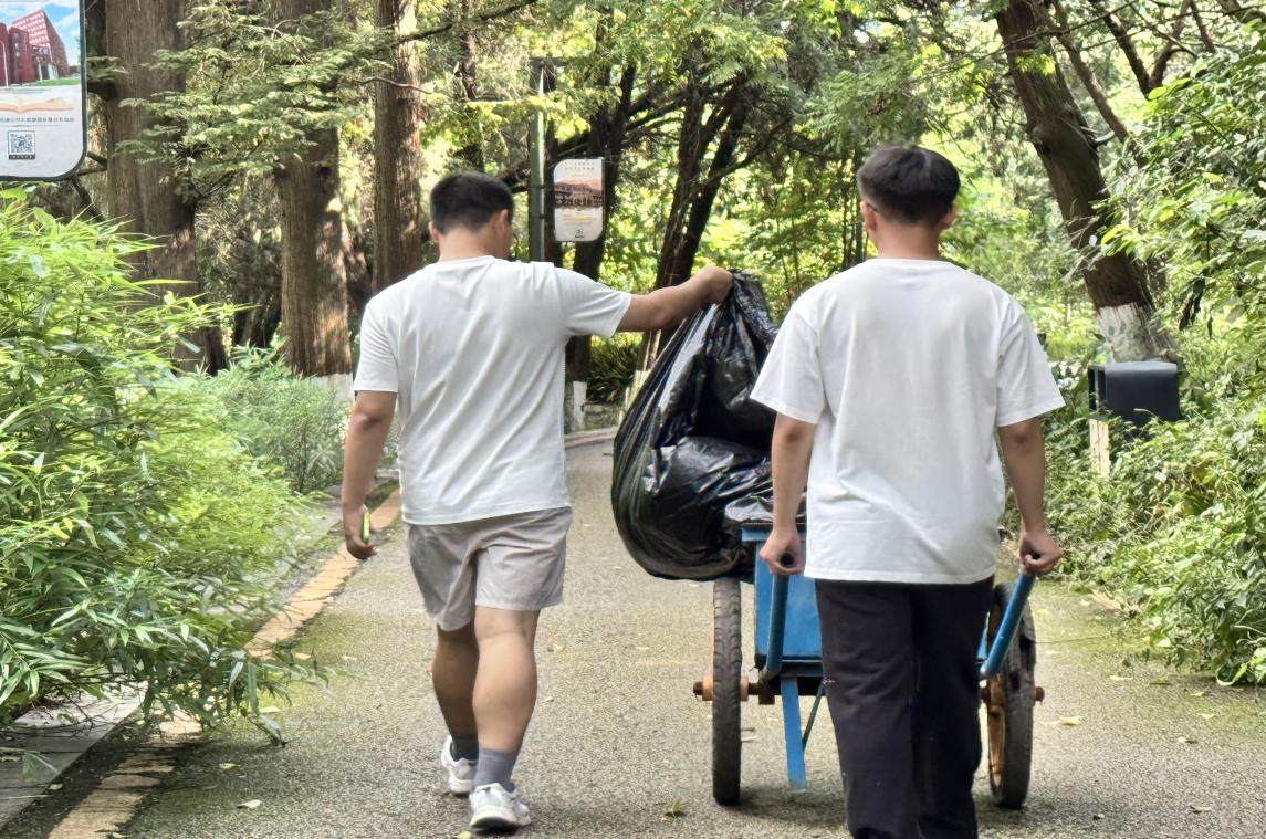 协作:众志成城见效能完成修整任务后,同学们立即转入清运环节。男同学主动承担重活,熟练分装杂草,推车往返清运;其他同学积极配合,彼此鼓劲。整个流程衔接顺畅、高效有序,充分展现了团队的凝聚力与协作精神。