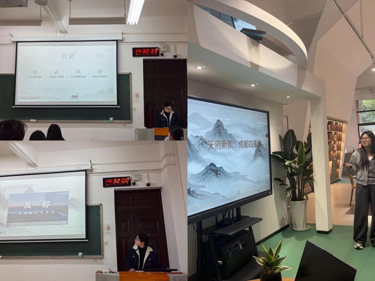 对成都与长沙这两座“幸福感”城市的分享,同学们的讲解充满了味觉与视觉的细节。主讲成都的小组不仅提到“川菜博物馆”里体验豆瓣酱的制作,更分析了宽窄巷子如何将“慢生活”包装成可消费的文旅产品;主讲长沙的小组则深入探讨了文和友如何通过收集数十万件老物件,在商业综合体内构建了一个关于“老长沙”的沉浸式记忆剧场,成为引爆社交媒体的关键。