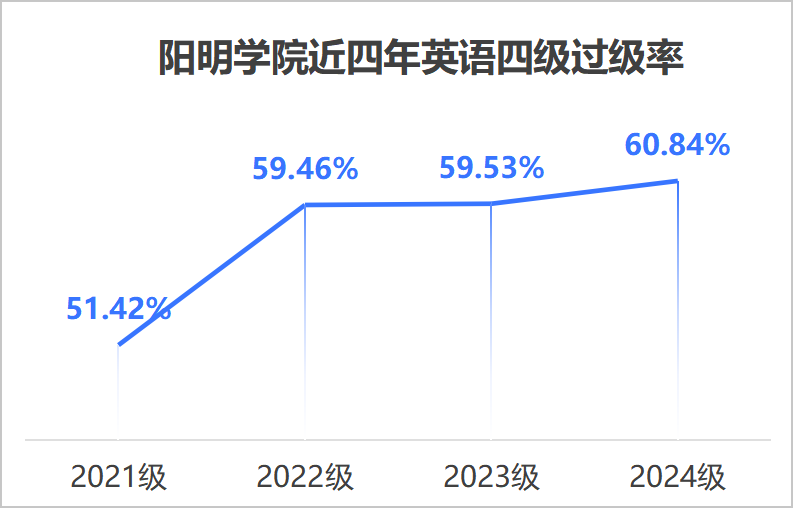 阳明学院始终将英语四级备考服务作为提升学生语言应用能力的重要抓手,历年数据显示,学院英语四级过级率呈逐年递增态势,2024级更是攀升至60.84%。