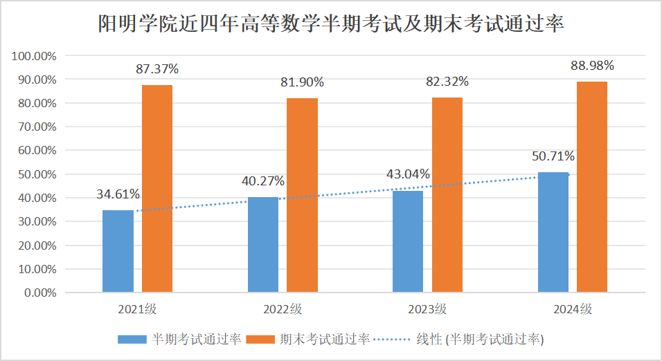 高等数学作为核心基础课程,其学业质量直接影响学生后续专业学习与能力发展。阳明学院已连续4年开展高等数学半期考试,通过规范化考试实现学业质量动态监测,历年课程总体通过率均保持在80%以上,充分体现学院在基础课程教学质量管控方面的成效。